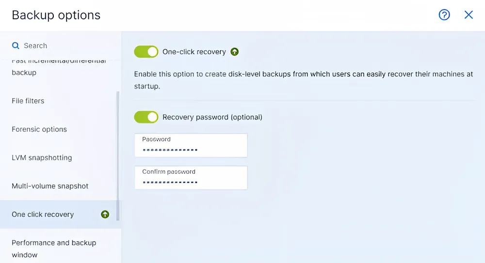 Speed up the recovery process of multiple workloads and minimize IT efforts by offloading the recovery to the end-users. By enabling the one-click recovery in the protection plan, you can easily empower non-technical end-users with a simplified, automated recovery of an entire workload.